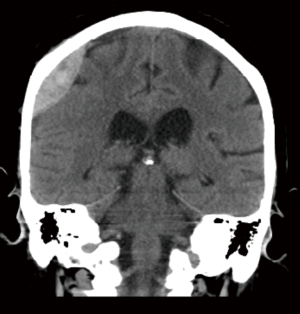 The classic presentation of an acute EDH is a loss of consciousness followed by a lucid interval and obtundation in sequence, and a lens shaped hemorrhage on CT (Figure 1). The source of this hemorrhage is typically the middle meningeal artery, however, bleeding may occur from a sinus or the bone itself in the setting of a skull fracture. Indications for operative management are based on imaging and patient status. A volume greater than 30 cc should be evacuated regardless of GCS. If the volume is less than 30 cc or less than 15 mm in thickness on the CT scan or with less than 5 mm of midline shift and GCS greater than 8, the patient may be managed non-operatively. If the decision to proceed to the OR is made, it should be done as soon as possible especially in the setting of GCS <9 or anisocoria. There are no studies that support a single treatment method. A craniotomy, however, does provide more complete hematoma evacuation (39).