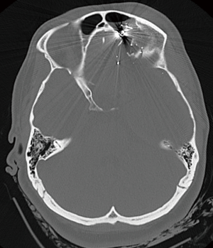Certain types of skull fractures warrant surgical intervention. Indications for surgery include open skull fractures depressed to a degree greater than the thickness of the skull. These should be operated on to prevent infection and further damage to underlying brain parenchyma (Figure 4). At times, an open depressed skull fracture can be treated non-operatively if there is no evidence of dural penetration, no pneumocephalus, no significant intracranial hematoma, the depressed section is less than 1 cm, no involvement of the frontal sinus, no gross deformity and no wound infection or gross contamination are observed. Whether open depressed skull fractures are treated surgically, they should be treated with anti-epileptic drugs and antibiotics may be considered. Closed depressed skull fractures may be treated non-operatively. If the decision to proceed to the operating room is made, it should be done in a timely fashion, but is not necessarily emergent depending on the presentation and neurologic status. Methods for repair include elevation of the bone flap and debridement of the overlying tissue. Foreign objects if present should be removed and copious irrigation performed. If the fracture is open, complex and comminuted, the fractured cranium may be removed and the defect may be repaired later to help preventing subsequent infection. If the wound has no signs of gross contamination or infection, or if it was a closed fracture, using the original bone flap is an option (42).