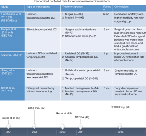 - Hutchinson PJ, Kolias AG, Timofeev IS, et al. Trial of Decompressive Craniectomy for Traumatic Intracranial Hypertension. N Engl J Med 2016;375:1119-30. [Crossref] [PubMed]
